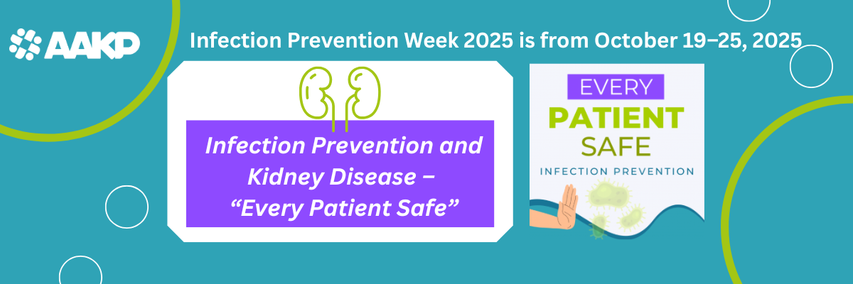 AAKP proudly recognizes October 19–25 as National Infection Prevention Week, reaffirming our commitment to protecting kidney patients, caregivers, and the professionals who serve them. Infections remain a leading cause of hospitalization and complications for people living with kidney disease, but simple actions—consistent hand hygiene, staying current on recommended vaccinations, safe catheter and access care, proper environmental cleaning, and staying home when ill—saves lives. All week, AAKP will share educational resources, patient voices, and practical tips.